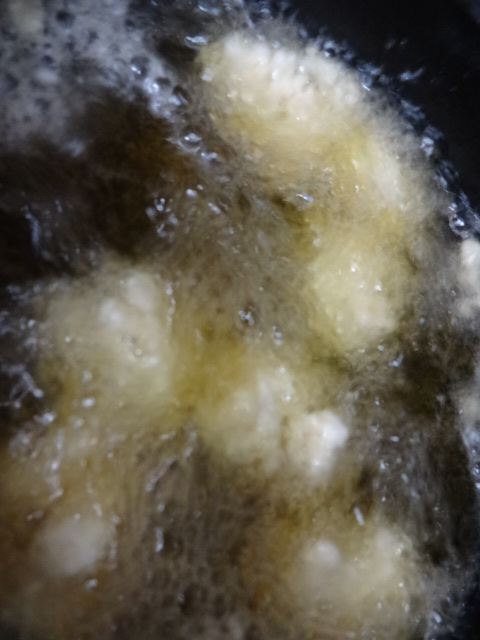 卵白、片栗粉、小麦粉の溶き粉で、油で揚げました。