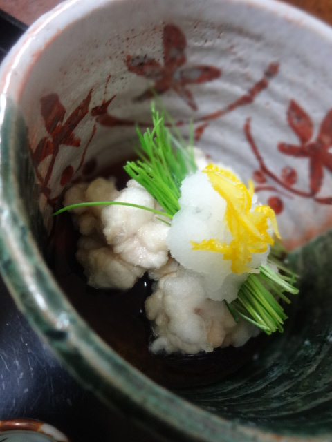 芽葱、大根おろしをのせ、天に黄柚子の刻んだものを添えました。