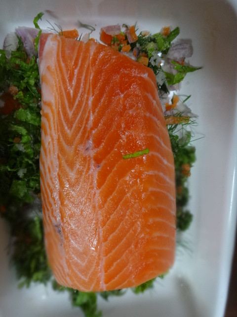 就寝前、サーモンのマリネを下準備