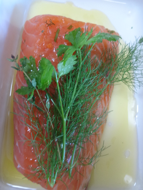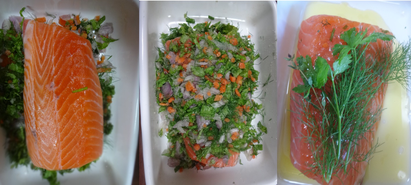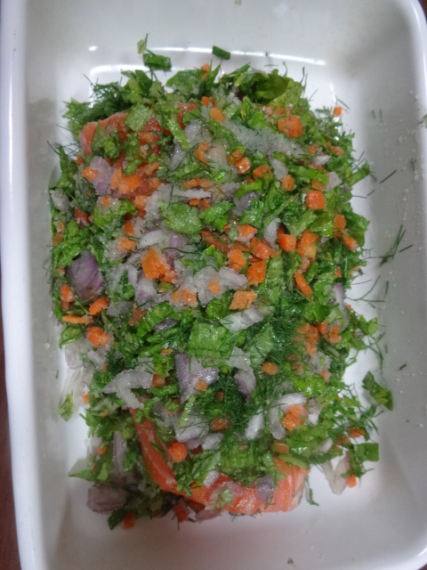 パ セリ軸、セロリの葉、ベルギーエシャロット、デイル、人参の皮(臭み消しなので、食べないものですし)コリアンダーシード、塩、白コショウです。ケイパー や、マスタードシードなども使う方もいると思います。私は、残り物でやっつけてしまうので、どこかボンヤリ、なんちゃってです。これは、オリーブ油につけ る際、ふき取りますので。