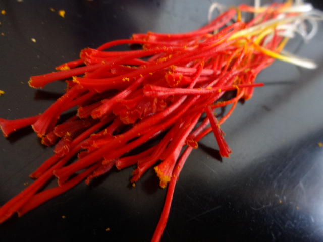 紙に包んで軽く焦がさないように焼いたサフランを水につけておいた液を入れて、