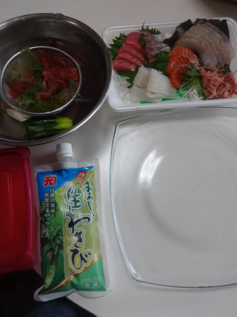 08 June 1500円のおまかせ刺し盛 1500円盛り 桜エビは、煎りうに和えに 小鉢に下関の河豚ウニ和え あしらいを少しそえて。 夏っぽくなってきたので、わさび台を桔梗胡瓜にしました。かんざしは、岩本農園のミニ大根で。つのまた、あかとさか、あおとさか・・・塩蔵を別に買い置きし冷凍保存。使う時塩抜きして使います。よく居酒屋さんでみる山葵、これが好きなので、我が家はこれを使用。チルド室で保存しています。 こんな感じで、昨日の焼肉で開けた蒼天伝をいただく準備を。ww [0回]
