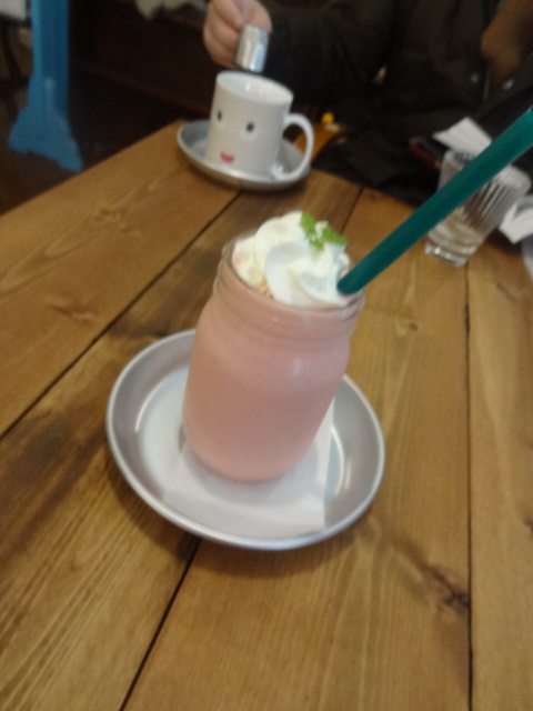 奥の面白い顔のマグは、ブレンドコーヒーです。