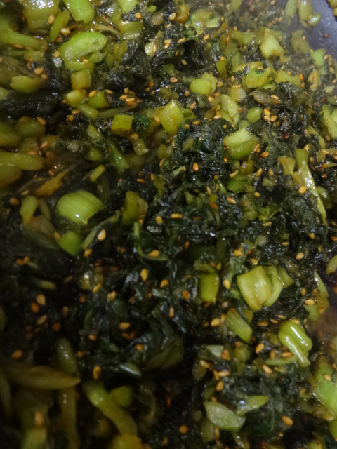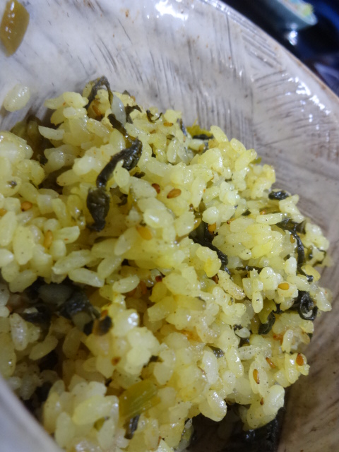 岩手町の田村孝美さんが、かつお菜を植えて、販売してくださったので、高菜の親戚、かつお菜は、手に入りやすかった我が家。それを漬物にしておいたので、まだ古漬けになってはいませんでしたが、刻み絞り(大事、ギュッと絞って)、ターメリック(ウコンを入れてつけたものを妄想し)、一味、砂糖、薄口醤油、胡麻油、いりごまで炒めた、高菜炒めもどきを作る。