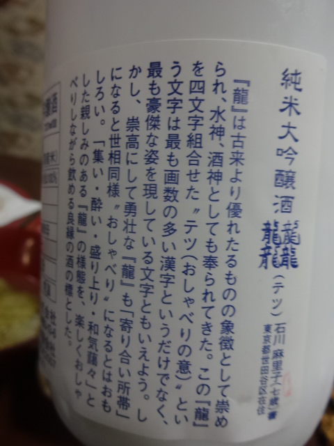 25 December 龍龍龍龍(てつ)純米大吟醸雫酒と、生ハム&鴨ハム 龍龍龍龍(てつ)純米大吟醸雫酒 東の麓×家庭画報リンベルセレクション ボンクラージュで買った生ハムと、鴨ハム 岩本農園さんの白菜と、「肉のふがね」からお取り寄せの二戸地鶏、それの鶏がらの中華スープ 里芋とやまと豚の煮物 さつま揚げ ボンクラージュで買った生ハムと、鴨ハムで、日本酒を飲みたかったので 切って、アルミ箔に包んでいただき、この寒さなので、持ちかえって来たもの。 少し熟成感があるものがいいかもということで、龍龍龍龍(てつ)純米大吟醸雫酒 にほんブログ村 にほんブログ村 にほんブログ村 にほんブログ村 [0回]PR