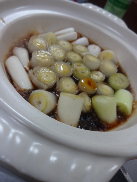 This is "leek pot(NEGI-NABE葱鍋)". This dish puts leek(SHIRONEGI白葱) in "earthen pot(DONEBE土鍋)" and boils under the WARISHITA 割り下.