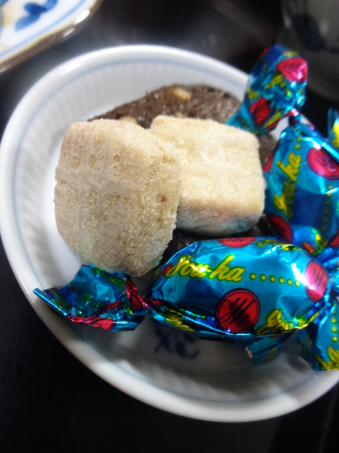 I drank Ryukyu awamori "Kume sen"琉球泡盛「久米仙」 while eating cloud kou of clothes of Nago coffee (UTCHIN KOU雲衣餻) and a coffee rusk. And I also ate chocolate while drinking Ryukyu awamori "Kume sen".