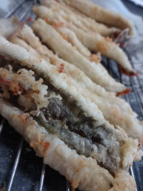 穂先を半割にしています。穂先から包丁を入れるのではなく、葉先を軸の真ん中に入れて穂先方向に平行に抜きます。ポテトは、二番油で揚げています。