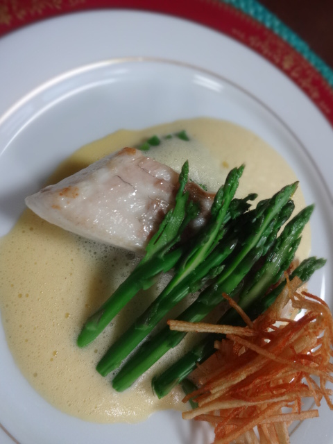 卵黄1、白ワイン、塩、白コショウ、レモン汁、カイエンヌペッパーを80℃湯煎にあてながら、ハンドミキサーで泡立て、途中で湯煎で溶かしたバターを入れました。バター、卵黄の濃度があがれば重めに仕上がりますし、空気を入れて、抑え目にすれば軽めになります。